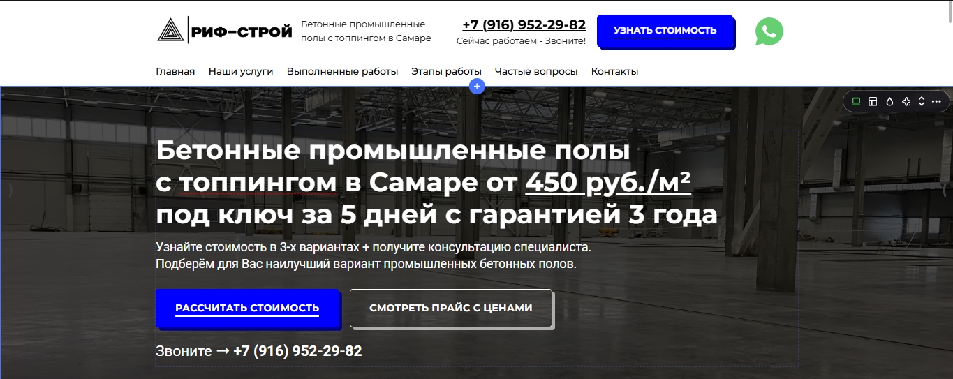 - Разработали продающий сайт по "рабочему шаблону" под направление бетонных полов, отдельно сделали дополнительную страничку под резиновые полы. Сайт заполнили всей нужной информацией о клиенте, сделали SEO-настройки и написали конкурентоспособное предложение.