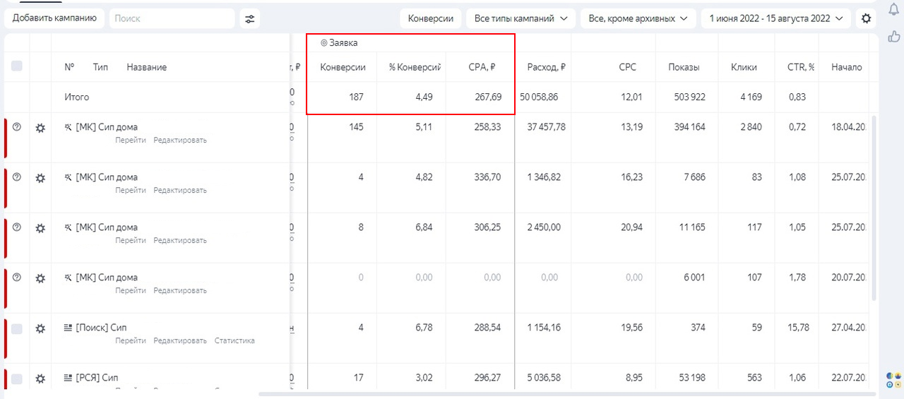 Результат: 187 заявок по 267 руб. из Яндекс Директ